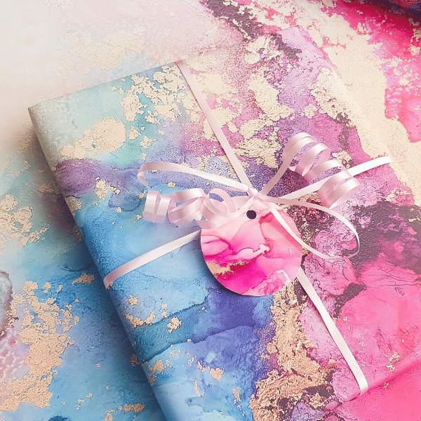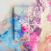 Rainbow Wrapping Paper featuring vibrant alcohol ink artwork. Perfect for gift wrapping on birthdays, Mother's Day, and Valentine's Day. Ideal for adding a splash of color and creativity to any present.